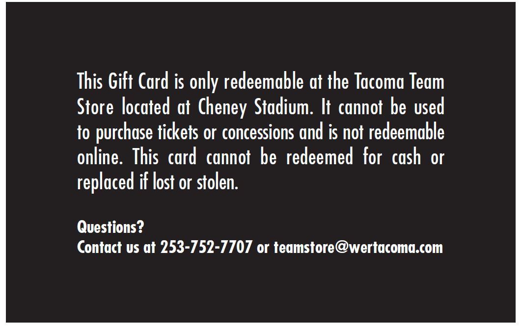 Please note Team Store Gift Cards are not redeemable online. Team Store Gift Cards can be redeemed in store at Cheney Stadium. The gift cards cannot be used to purchase tickets or concessions at Cheney Stadium. If you are looking for stadium wide gift card